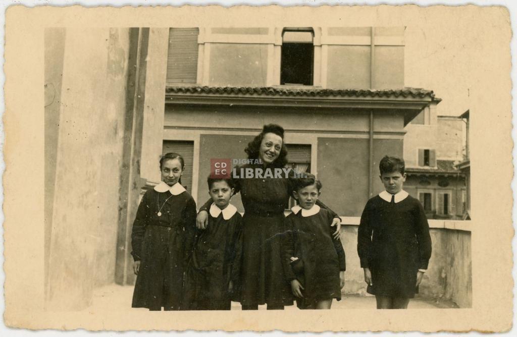 titolo attribuito | Ritratto della maestra Noemi Friedenthal in Richetti con gli studenti Ada, Luigi Grunich, Carlo Rimini e Gianfranco Sforni sulla terrazza della sinagoga di Verona |
