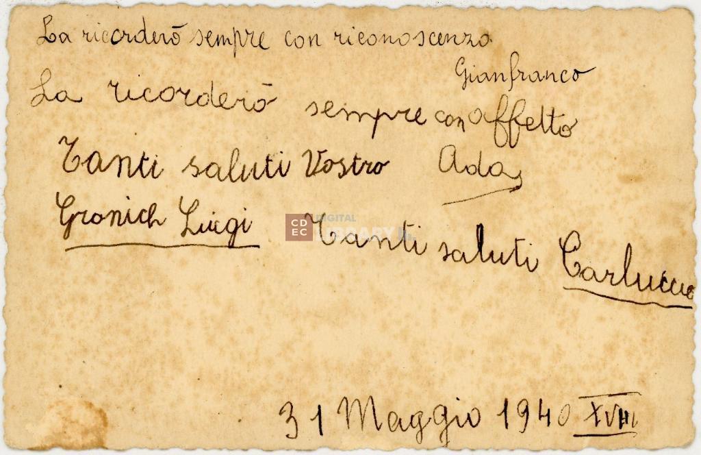 iscrizioni | sul retro del supporto la dedica "La ricorderĂ² sempre con riconoscenza Gianfranco/ La ricorderĂ² sempre con affetto Ada/ Tanti saluti Vostro Gronich Luigi/ Tanti saluti Carluccio/ 31 maggio 1940 XVIII" |