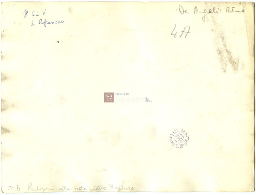iscrizioni | sul verso del supporto le indicazioni manoscritte a penna "Il CLN di Refrancore" e a matita "De Angeli Arturo 4A" e "n. 5 Partigiani alla Festa della Resistenza" |