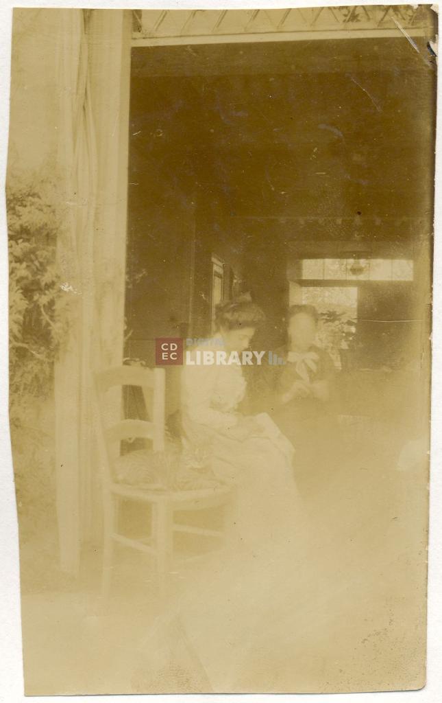 osservazioni | La fotografia รจ accompagnata dalla seguente didascalia, manoscritta da Ugo Nizza e apposta sulla pagina dell'album: "mia madre zia Amelia (sor.[ella] del nonno Lelio Levi)/ 1905? La casa di Soragna". Nella fotografia si riconoscono a sinistra Anna Levi (poi coniugata Nizza) e a destra Amelia Levi |