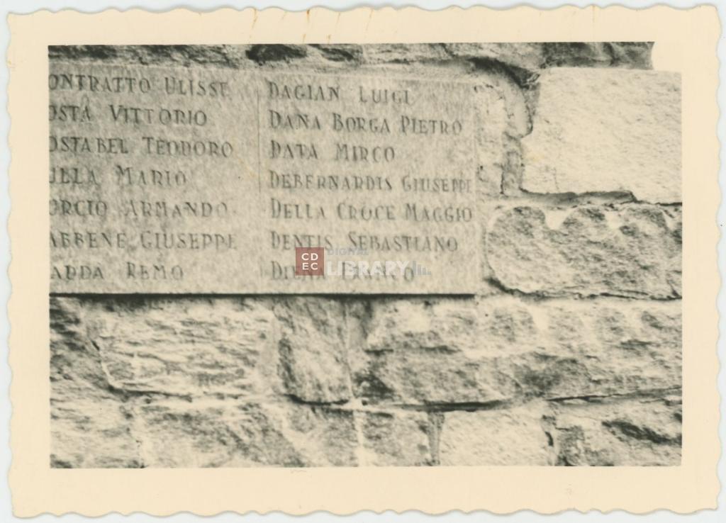 notizie storico-critiche | Sulla lapide, oltre al nome di Diena Franco (ultimo dell'elenco), si possono leggere in ordine alfabetico anche i nomi dei seguenti partigiani: Contratto Ulisse, Costa Vittorio, Costa Bel Teodoro, Culla Mario, Curcio Armando, Dabbene Giuseppe, D'Adda Remo, Daglian Luigi, Dana Borga Pietro, Data Mirco, Debernardis Giuseppe, Della Croce Maggio e Dentis Sebastiano |