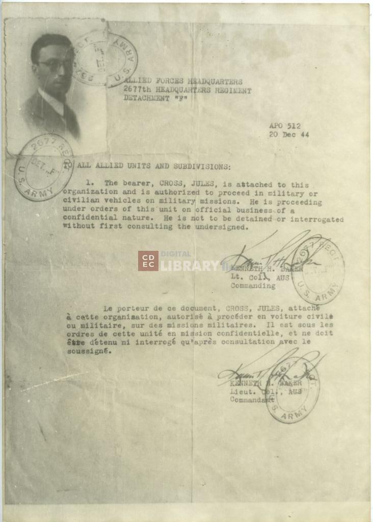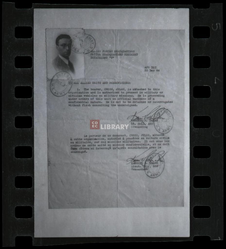 titolo attribuito | Ritratto di Giulio Colombo (alias Cross Jules) sulla lettera di autorizzazione rilasciata dal Allied Forces Headquarters |