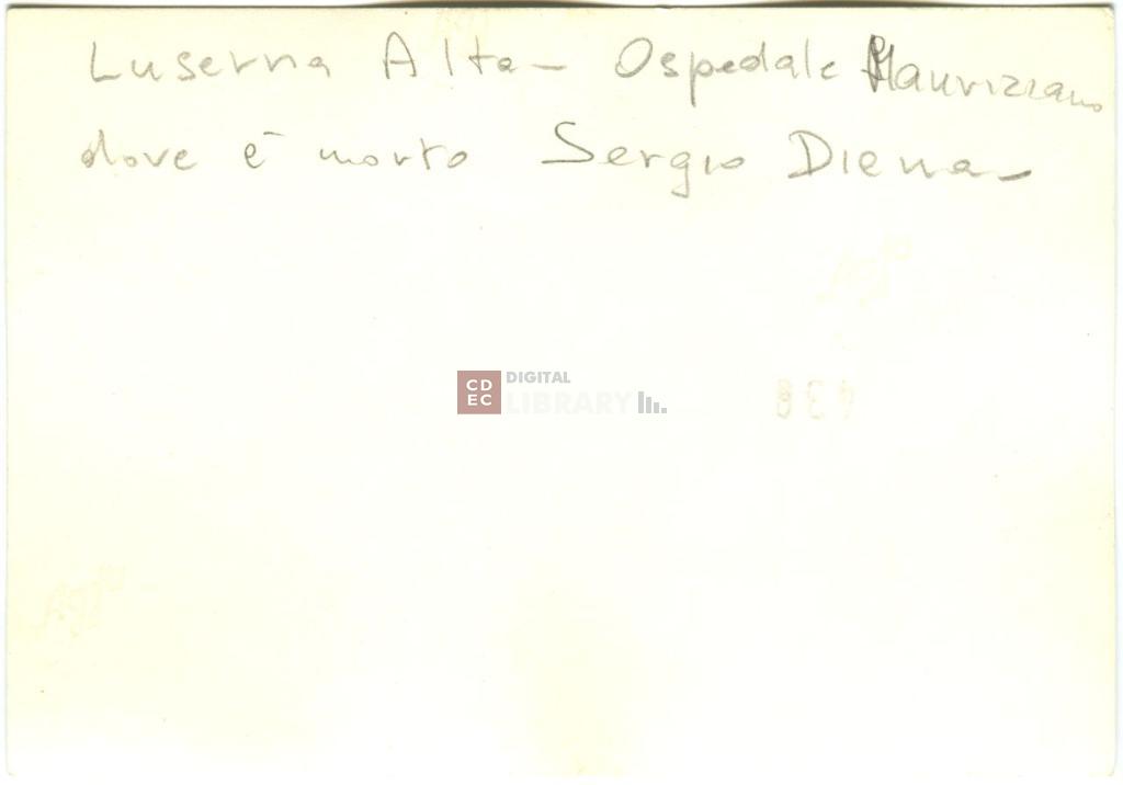 | notizie storico-critiche | L'Ospedale mauriziano, fondato nel 1855 dall'Ordine dei Santi Maurizio e Lazzaro, è ubicato in via Generale Diaz n. 58; il 4 dicembre 1943 vi morì Sergio Diena a seguito delle ferite riportate in un combattimento tra partigiani e soldati tedeschi. Lo scatto fa parte di un servizio fotografico che mostra vedute di alcuni luoghi emblematici di Luserna San Giovanni durante la Seconda Guerra mondiale, come confermato dalla tipologia delle indicazioni manoscritte, dalla tipologia di carta fotografica e soprattutto dal numero di serie "438" apposto sul verso del supporto. Altri scatti sono conservati nel presente fascicolo e nel fascicolo "Artom Emanuele" del fondo Antifascisti partigiani (b. 1, fasc. 12) |