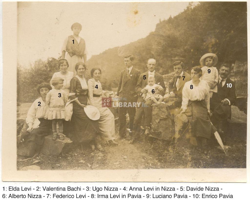 osservazioni | La fotografia รจ accompagnata dalla seguente didascalia, manoscritta da Ugo Nizza e apposta sulla pagina dell'album: "1915/ come sopra + Valentina Bachi". Nella fotografia si riconoscono da sinistra 1: Elda Levi (poi coniugata Coen Sacerdotti), 2: Valentina Bachi, 3: Ugo Nizza, 4: Anna Levi in Nizza, 5: Davide Nizza, 6: Alberto Nizza, 7: Federico Levi, 8: Irma Levi in Pavia, 9: Luciano Pavia, 10: Enrico Pavia |