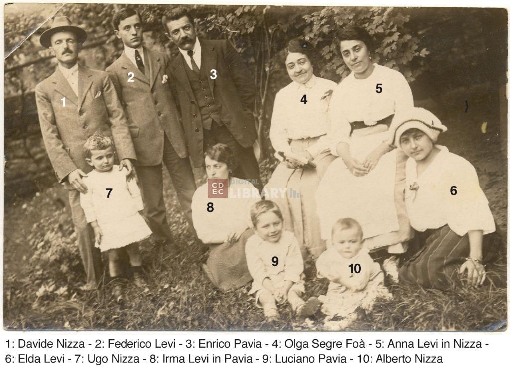osservazioni | La fotografia è accompagnata dalla seguente didascalia, manoscritta da Ugo Nizza e apposta sulla pagina dell'album: "papà - Ugo - Federico Levi - Enrico Pavia - Irma Levi Pavia - Luciano Pavia - "zia" Olga - Alberto - mamma - Elda Levi/ agosto 1915 - Val Chisone". Nella fotografia si riconoscono da sinistra 1: Davide Nizza, 2: Federico Levi, 3: Enrico Pavia, 4: Olga Foà in Segre, 5: Anna Levi in Nizza, 6: Elda Levi (poi coniugata Coen Sacerdotti), 7: Ugo Nizza, 8: Irma Levi in Pavia, 9: Luciano Pavia, 10: Alberto Nizza |