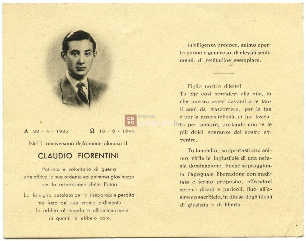 notizie storico-critiche | Il ritratto fotografico è parte del biglietto realizzato in concomitanza del "1° anniversario della morte gloriosa di Claudio Fiorentini/ Patriota e volontario di guerra che offriva la sua ardente ed animoso giovinezza per la resurrezione della Patria/ La famiglia desolata per la irreparabile perdita ma fiera del suo eroico ardimento lo addita al ricordo e all'ammirazione di quanti lo ebbero caro." |