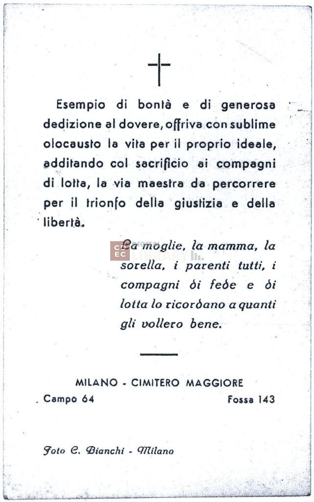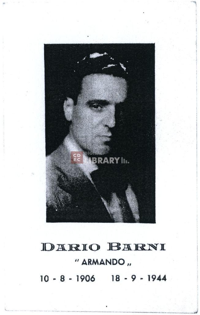 notizie storico-critiche | Il ritratto fotografico è parte del biglietto - realizzato dal fotografo C. Bianchi di Milano - in memoria di Dario Barni, nome di battaglia "Armando", morto in combattimento sulle colline dell'Oltrepò Pavese nel settembre 1944 e sepolto nel Cimitero Maggiore di Milano (campo 64, fossa 143) |