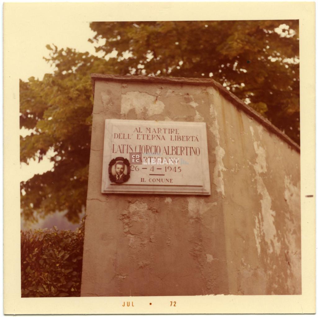 iscrizioni | nell'immagine la lapide riporta la scritta "Al martire dell'eterna libertà Latis Giorgio Albertino partigiano 26-4-1945/ Il Comune" - sul recto del supporto in basso la data "Jul 72" |