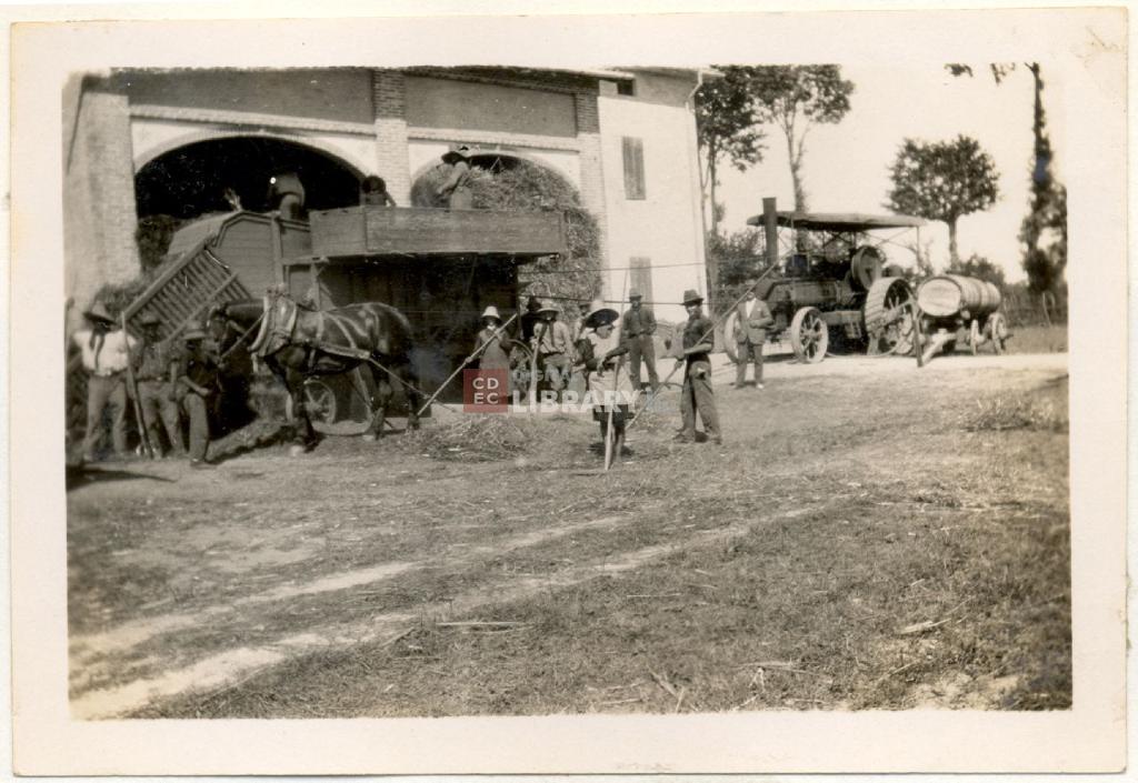 titolo attribuito | Ritratto di Renzo Levi con i contadini al lavoro durante la trebbiatura nell'aia del Podere Boschetto a Soragna |