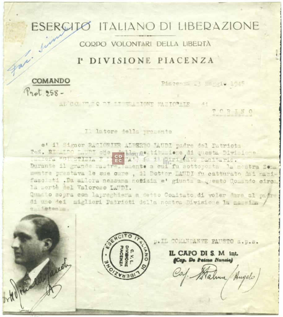 | notizie storico-critiche | Il ritratto fotografico di Rinaldo (detto Dino) Laudi fu incollato sulla richiesta redatta in data 23 maggio 1945 dalla 1° Divisione Piacenza del Corpo Volontari della Libertà dell'Esercito di Liberazione nazionale per l'assistenza ad Alberto Laudi nella ricerca del figlio Rinaldo. |