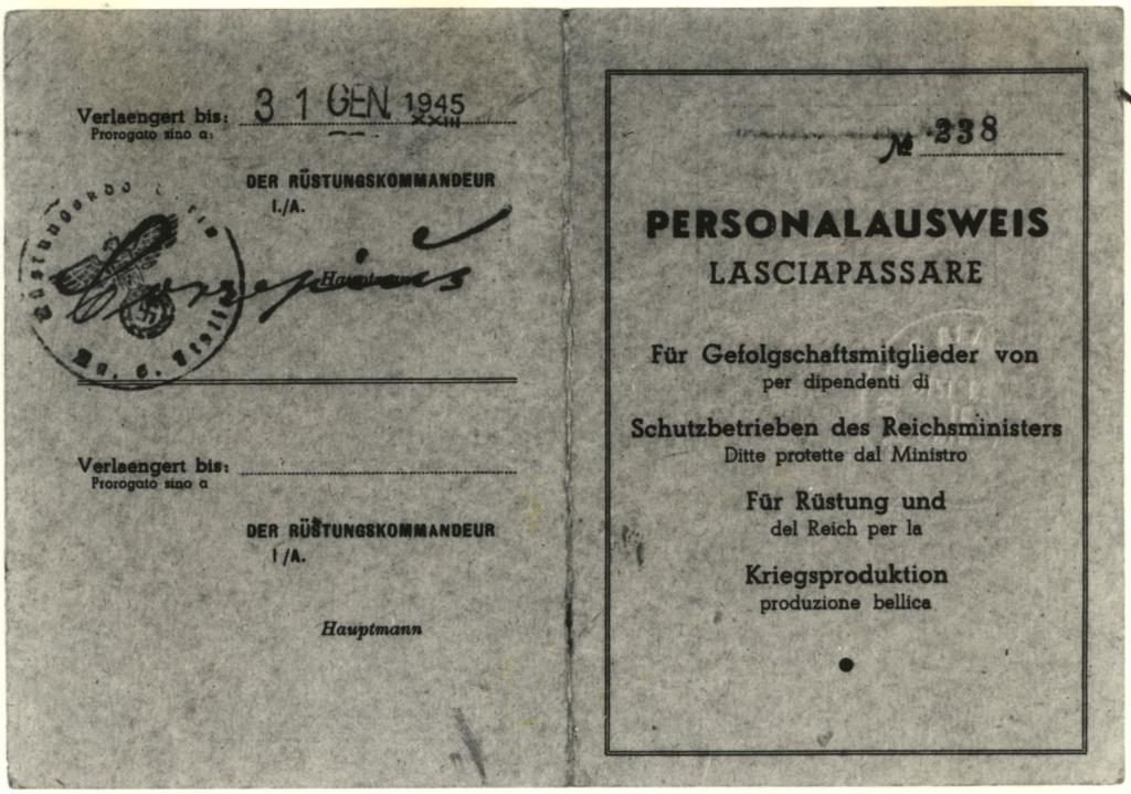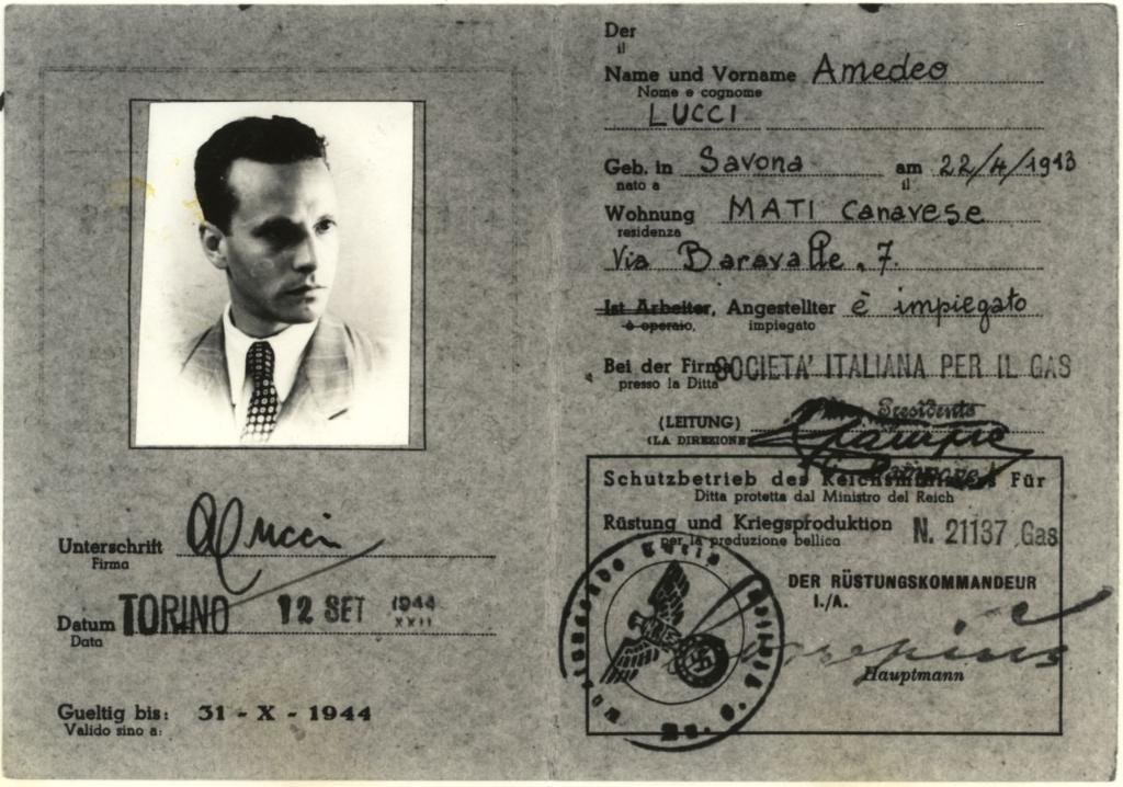 | notizie storico-critiche | Il ritratto fotografico è incollato sul "Lasciapassare per dipendenti di Ditte protette dal Ministro del Reich per la produzione bellica", emesso a Torino il 12 settembre 1944; il documento riporta le false generalità di Salvatore Aldo Luzzatto (alias Amedeo Lucci), impiegato presso la Società italiana per il Gas |