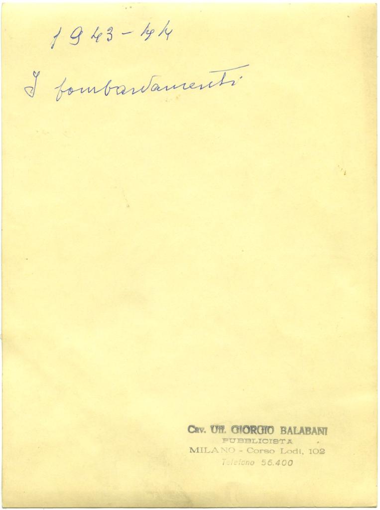 | iscrizioni | nell'immagine in basso a destra l'indicazione manoscritta a penna "opera del regime" e un'etichetta con la didascalia dattiloscritta "1943: un palazzo del Corso di Porta Romana" - sul verso del supporto l'indicazione manoscritta a penna "1943-44 I bombardamenti" |