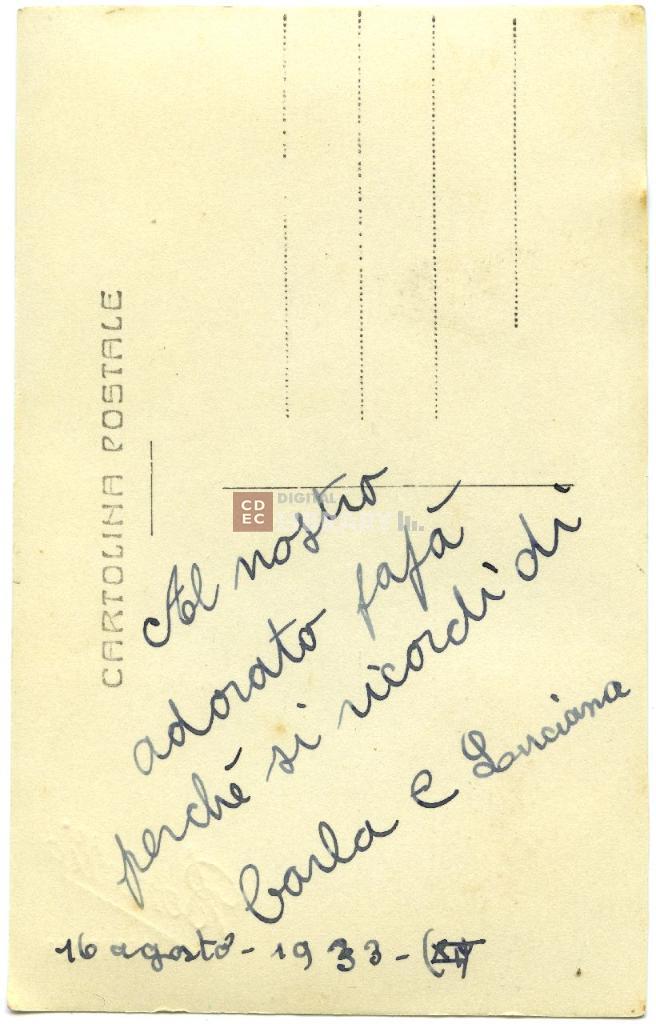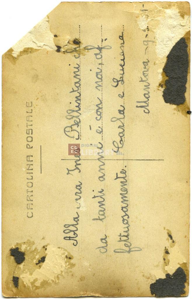 | iscrizioni | sul verso del primo supporto la dedica "Al nostro adorato papà perché si ricordi di Carla e Luciana/ 16 agosto 1933" - sul verso del secondo supporto la dedica "Alla cara Ines Bellintani da tanti anni è con noi, affettuosamente. Carla e Luciana/ Mantova 9-3-31" |