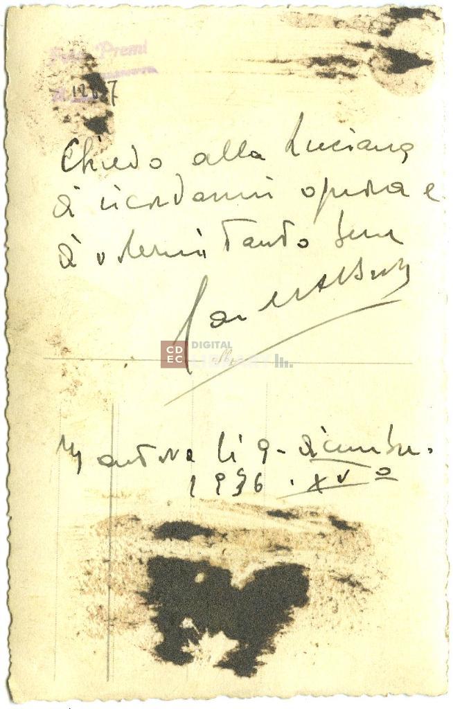 | iscrizioni | sul verso del supporto la dedica "Chiedo alla Luciana di ricordarmi [...] tanto bene [firma illeggibile]/ Mantova lì 9 dicembre 1936-XV" |