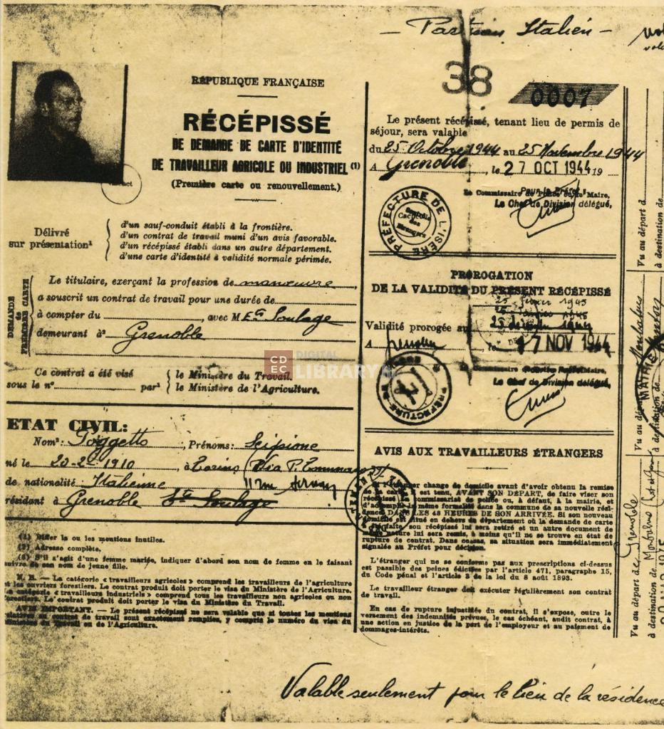 notizie storico-critiche | La "Ricevuta di richiesta di carta d'identità per lavoratori agricoli o industriali" fu rilasciata dalla Repubblica francese a Scipione Poggetto il 27 ottobre 1944 |