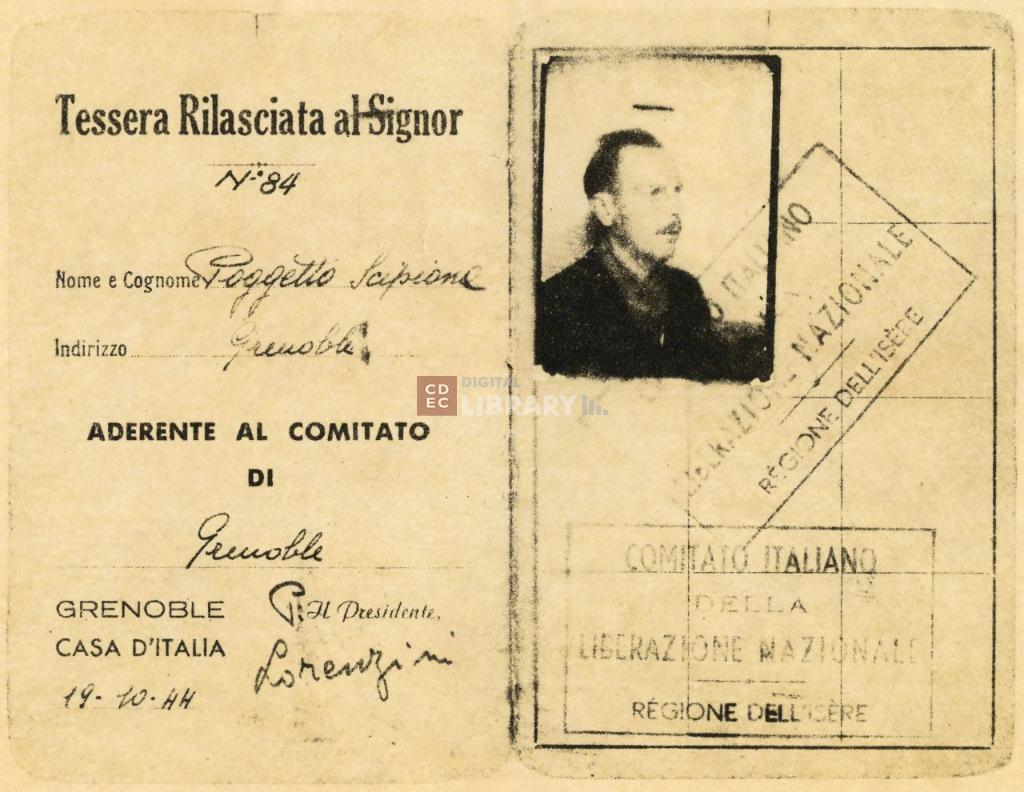 notizie storico-critiche | La Tessera del Comitato Italiano della Liberazione nazionale della Regione dell'Isère fu rilasciata a Grenoble il 19 ottobre 1944 a Scipione Poggetto |