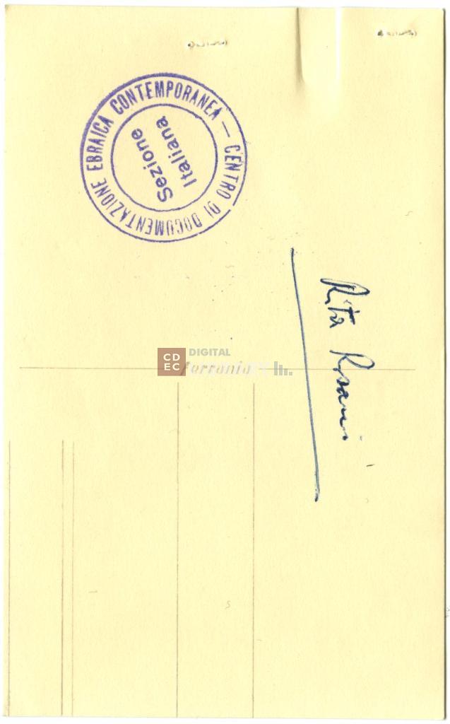 | timbri, marchi | sul verso del secondo supporto il timbro circolare a inchiostro blu con la scritta lungo il bordo "Centro di Documentazione Ebraica Contemporanea" e al centro "Sezione Italiana" - sul verso del terzo supporto il timbro ovale con la scritta in alto "Centro di Documentazione" e in basso "Ebraica Contemporanea" |
