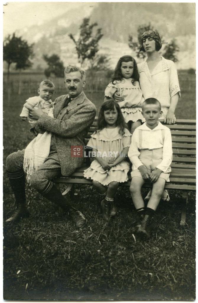 osservazioni | da sinistra in prima fila Eugenio Calabi in braccio al padre Giuseppe Calabi, Ornella Calabi (poi coniugata D'Ancona) ed Enzo Calabi; alle loro spalle a sinistra Tullia Calabi (poi coniugata Zevi) e a destra la madre Maria Bassani in Clabi |