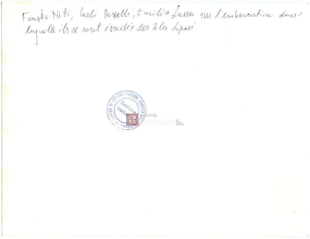 | iscrizioni | sul verso del supporto l'indicazione manoscritta in lingua francese "Fausto Nitti, Carlo Rosselli, Emilio Lussu sur l'embarcation dans laquelle ils se sont évadés des îles Lipari" |