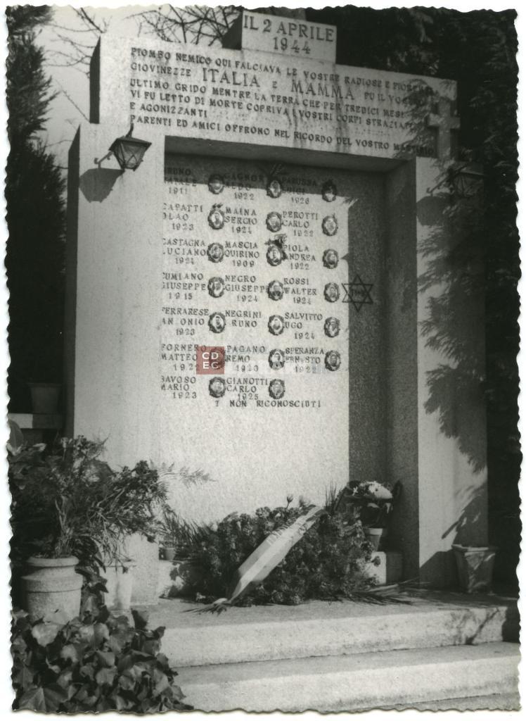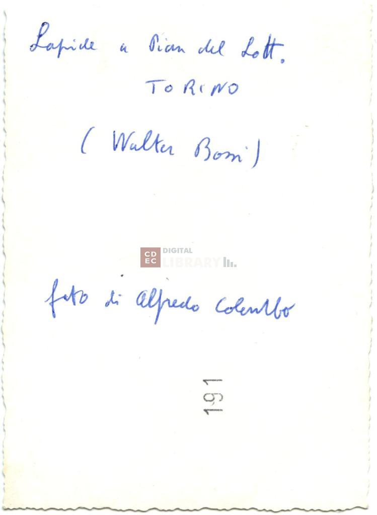 | iscrizioni | nell'immagine in alto l'epigrafe con la scritta "Il 2 aprile 1944/ piombo nemico qui falciava le vostre radiose e fiorenti giovinezze. Italia e mamma fu il vostro ultimo grido mentre la terra che per tredici mesi vi fu letto di morte copriva i vostri corpi straziati e agonizzanti/ Parenti ed amici offrono nel ricordo del vostro martirio" - sul verso del supporto l'indicazione manoscritta a penna "Lapide a Pian del Lot. Torino (Walter Rossi)/ foto di Alfredo Colombo" |