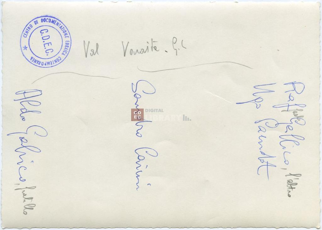 | osservazioni | Primo e secondo da sinistra Raffaele Gallico (con la pipa in bocca) e Ugo Sacerdote (con una macchina fotografica in mano); al centro Sandro Caimi; primo da destra Aldo Gallico (con una macchina fotografica al collo e il quotidiano "La Stampa" nella tasca della giacca) |