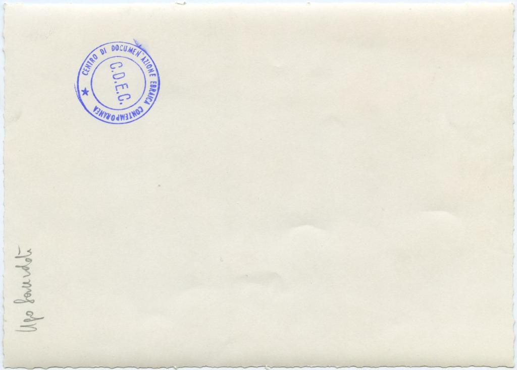 | timbri, marchi | sul verso del supporto il timbro circolare a inchiostro blu con la scritta lungo il bordo "Centro di Documentazione Ebraica Contemporanea" e al centro "C.D.E.C." |