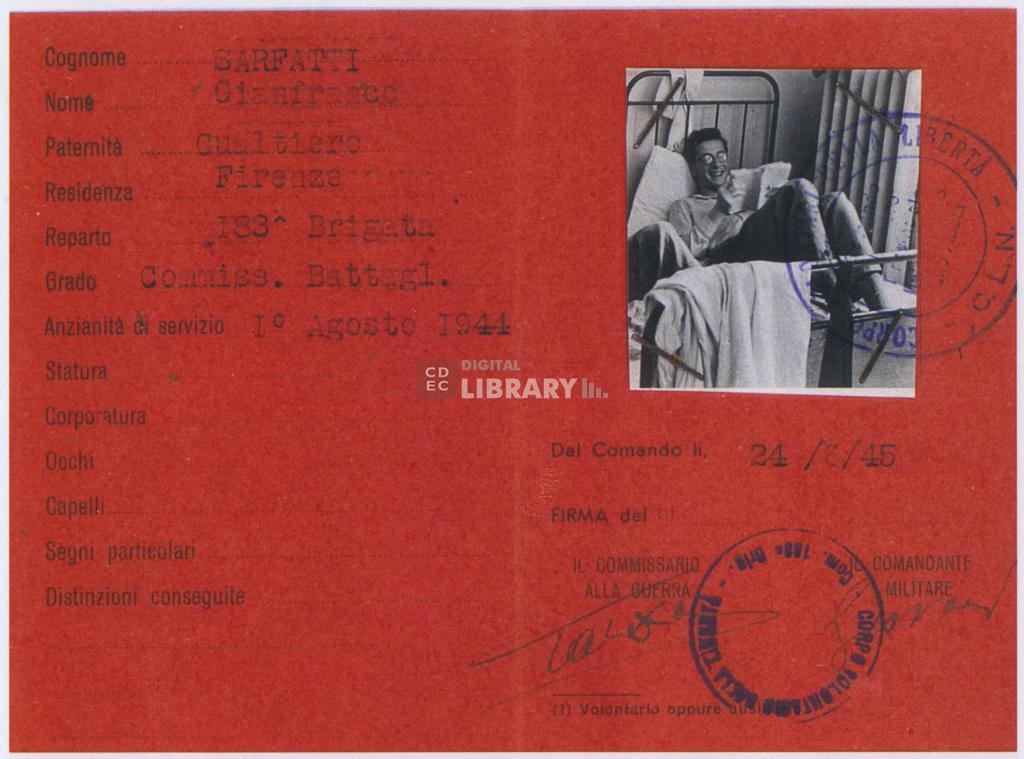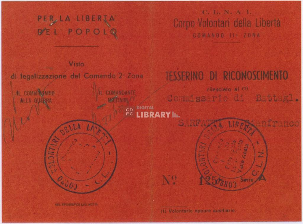 titolo attribuito | Tessera di riconoscimento del Corpo Volontari della Libertà di Gianfranco Sarfatti |