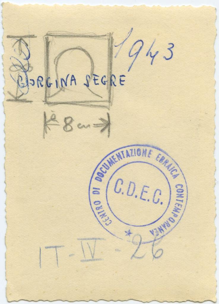 | timbri, marchi | sul verso del supporto il timbro circolare a inchiostro blu con la scritta lungo il bordo "Centro di Documentazione Ebraica Contemporanea" e al centro "C.D.E.C." |
