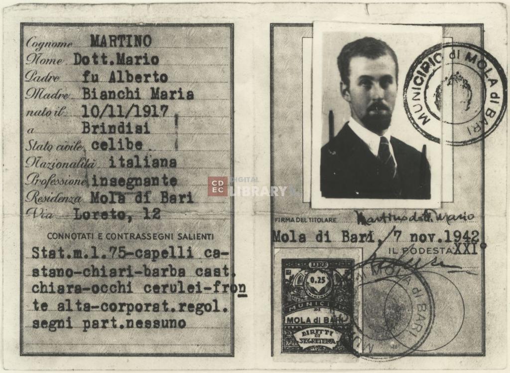 | notizie storico-critiche | Oltre alle false generalità di Marcello Morpurgo (alias Dott. Mario Martino), sul documento di riconoscimento venne apposto l'indicazione del Comune di Mola di Bari e la data 7 novembre 1942 |