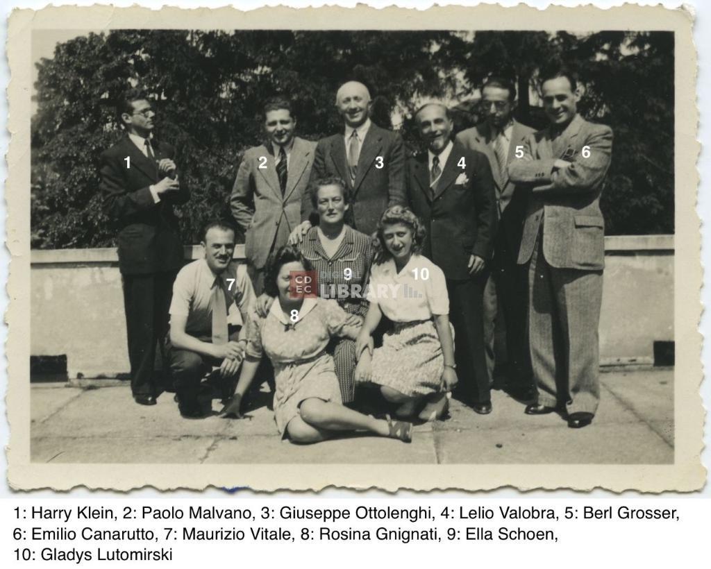 osservazioni | Nella fotografia si riconoscono 1: Harry Klein, 2: Paolo Malvano, 3: Giuseppe Ottolenghi, 4: Lelio Valobra, 5: Bernardo (Berl) Grosser, 6: Emilio Canarutto, 7: Maurizio Vitale, 8: Rosina Gnignati, 9: Ella Schoen, 10: Gladys Lutomirski |