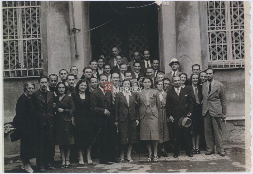 titolo attribuito | Ritratto di un gruppo di profughi in partenza per la Colombia con Lelio Valobra ed Enrico Luzzatto davanti alla sede della Delasem di Genova |