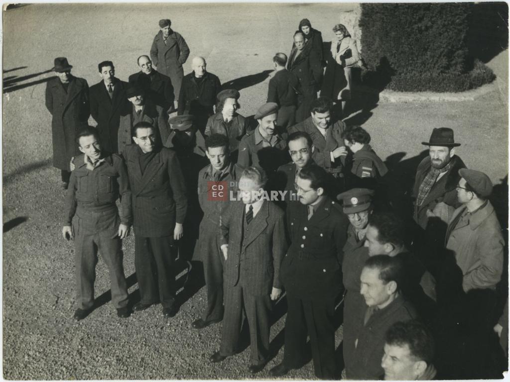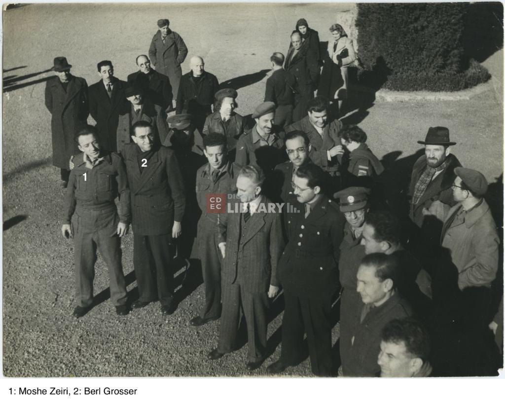 osservazioni | Nella fotografia si riconoscono a destra 1: Moshe Zeiri abbracciato a 2: Bernardo (Berl) Grosser |