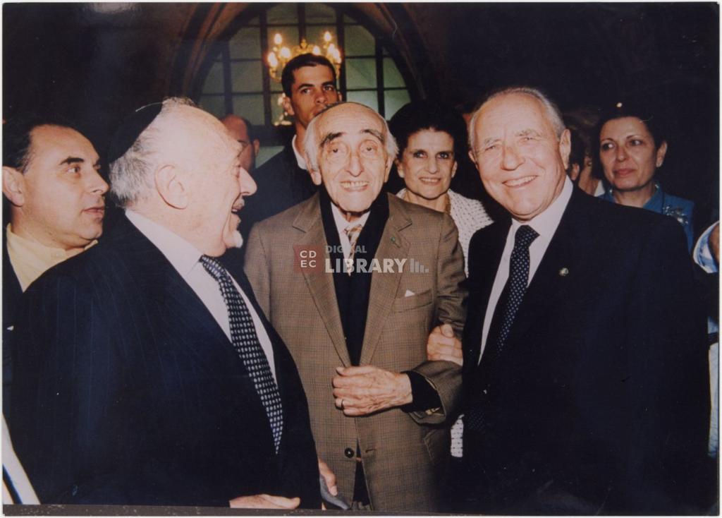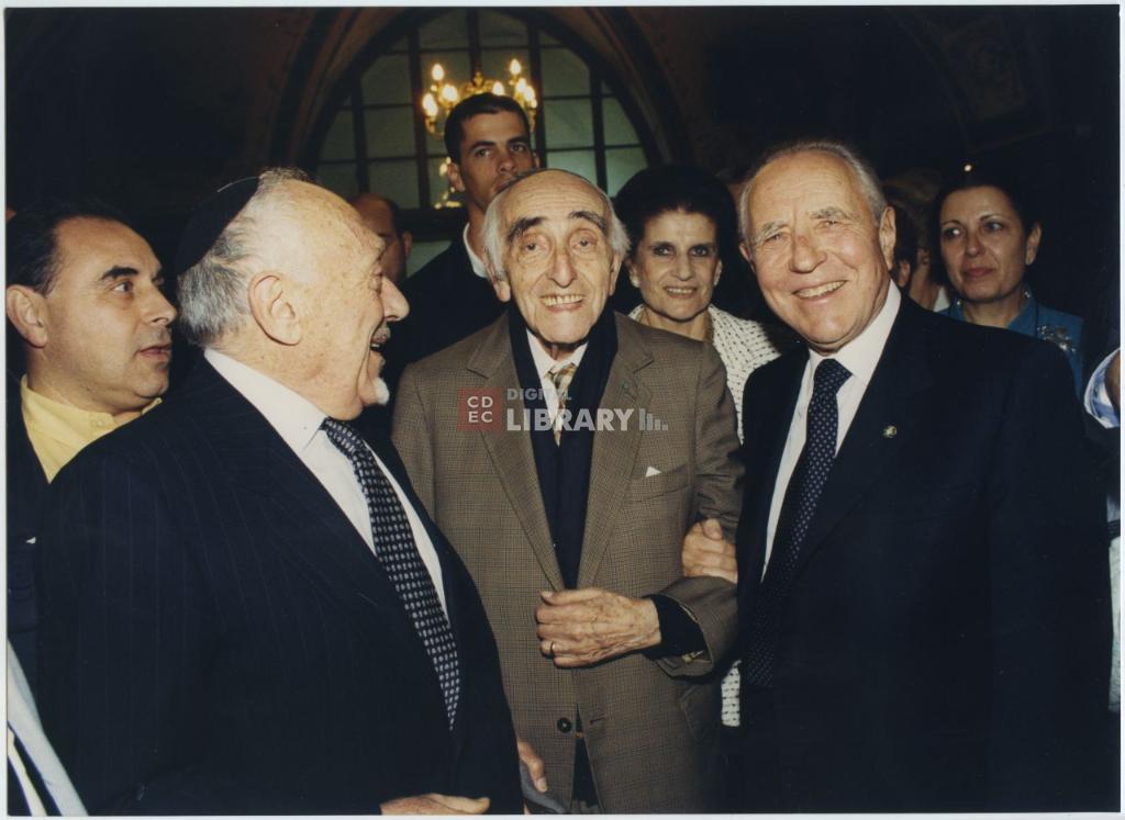 osservazioni | Nella fotografia si riconoscono in primo piano a sinistra rav Elio Toaff, al centro Bernardo (Berl) Grosser e a destra il Presidente della Repubblica Italiana Carlo Azeglio Ciampi |