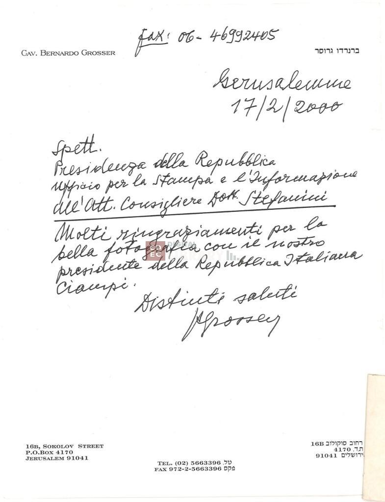 notizie storico-critiche | La fotografia fu consegnata a Bernardo Grosser in una cartellina che reca l'iscrizione "Presidenza della Repubblica/ Ufficio per la Stampa e l'Informazione/ Documentazione fotografica". In risposta il 17 febbraio 2000 il Cav. Bernardo Grosser invia un fax da Gerusalemme all'attenzione del Dott. Stefanini con il seguente testo "Molti ringraziamenti per la bella fotografia con il nostro presidente della Repubblica Italiana Ciampi. Distinti saluti B. Grosser" |