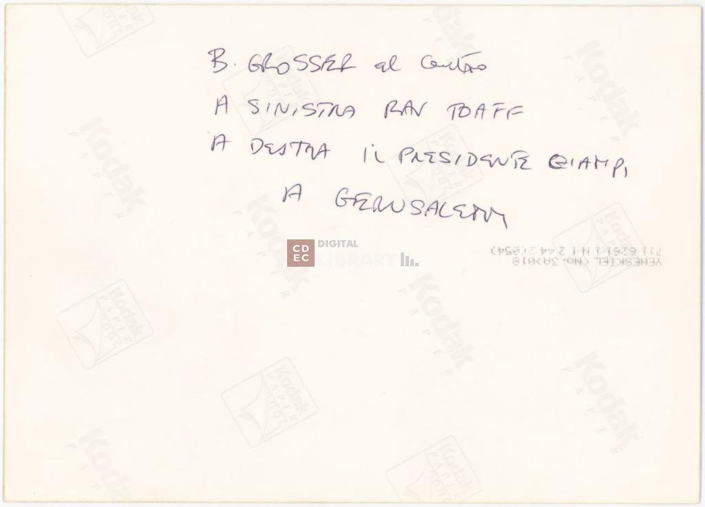 iscrizioni | sul verso del secondo supporto l'indicazione manoscritta da Donato Grosser "B. Grosser al centro/ a sinistra Rav Toaff/ a destra il Presidente Ciampi a Gerusalemme" |
