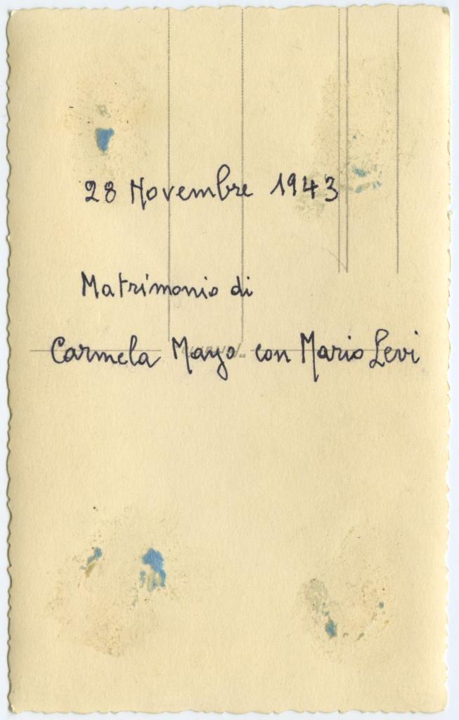 | iscrizioni | sul verso del supporto l'indicazione manoscritta "28 Novembre 1943/ Matrimonio di Carmela Mayo con Mario Levi" |