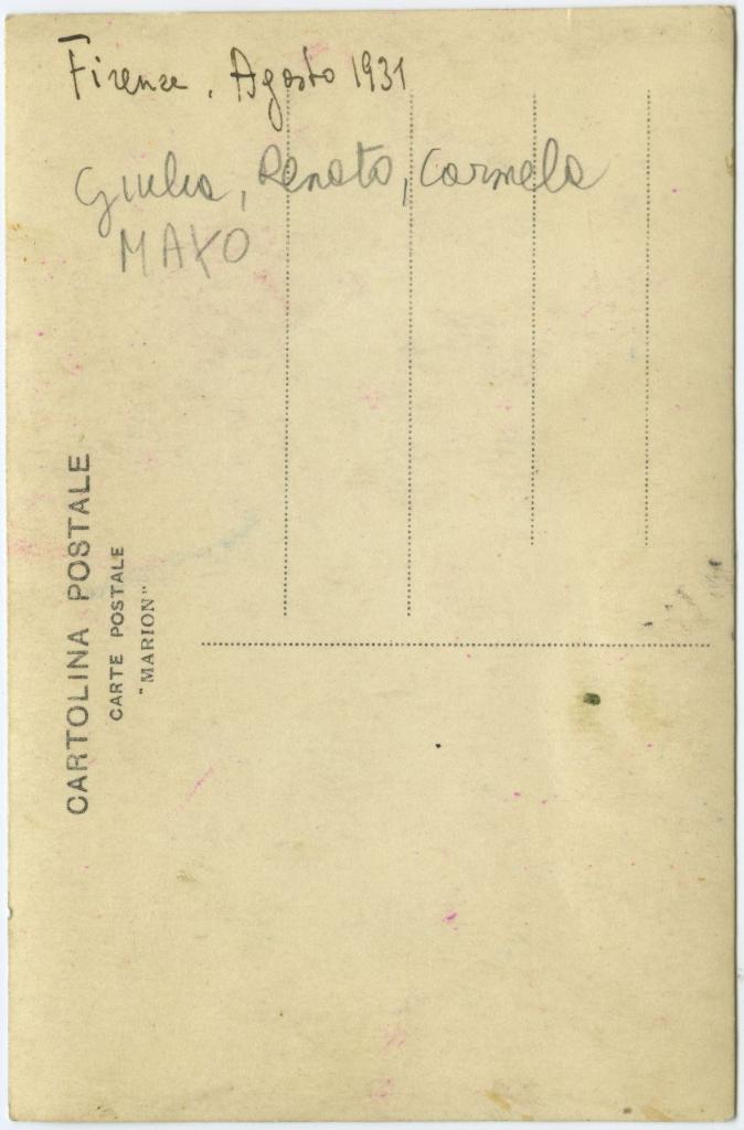 | iscrizioni | sul verso del supporto l'indicazione manoscritta "Firenze, Agosto 1931" e a matita "Giulia, Renato, Carmela Mayo" |