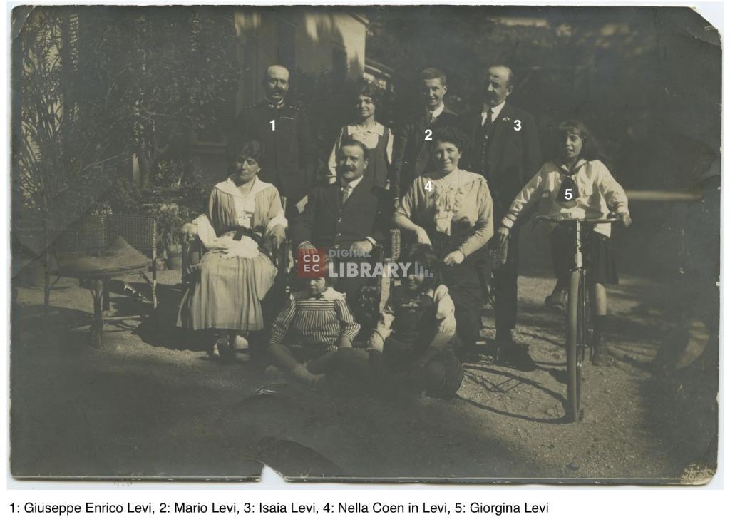| osservazioni | Nella fotografia si riconoscono 1: Giuseppe Enrico Levi, 2: Mario Levi, 3: Isaia Levi, 4: Nella Coen in Levi e 5: Giorgina Levi |
