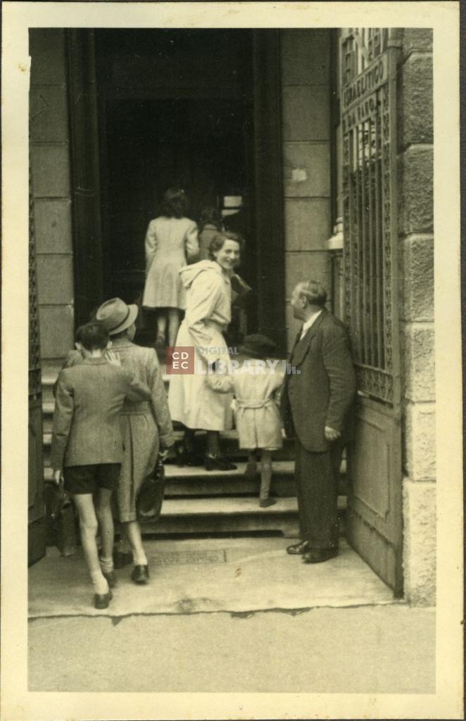 titolo attribuito | Ritratto della prof. Alda Perugia con i figli, il bidello Lombroso e alcuni alunni all'ingresso della scuola ebraica di Milano |