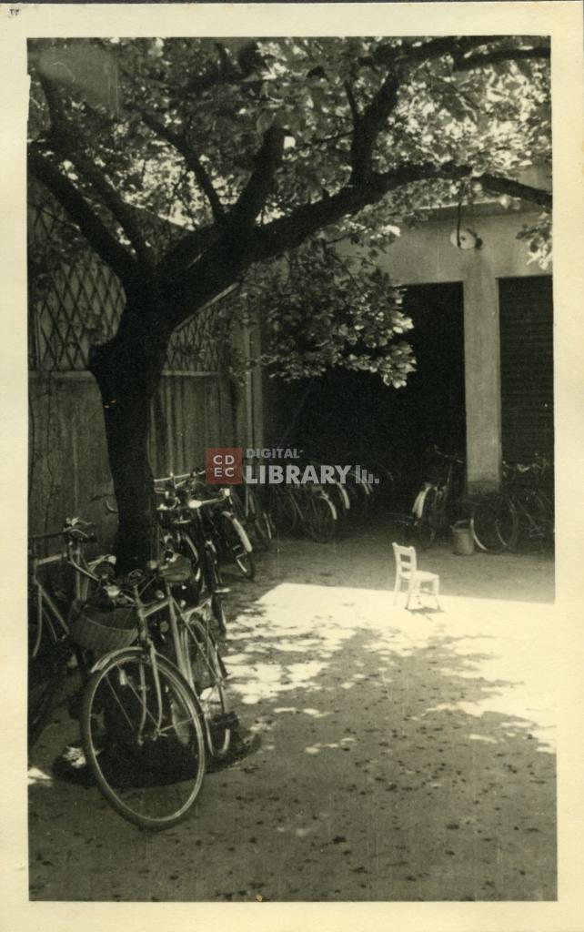 titolo attribuito | Veduta del cortile della scuola ebraica di Milano con il posteggio delle biciclette |