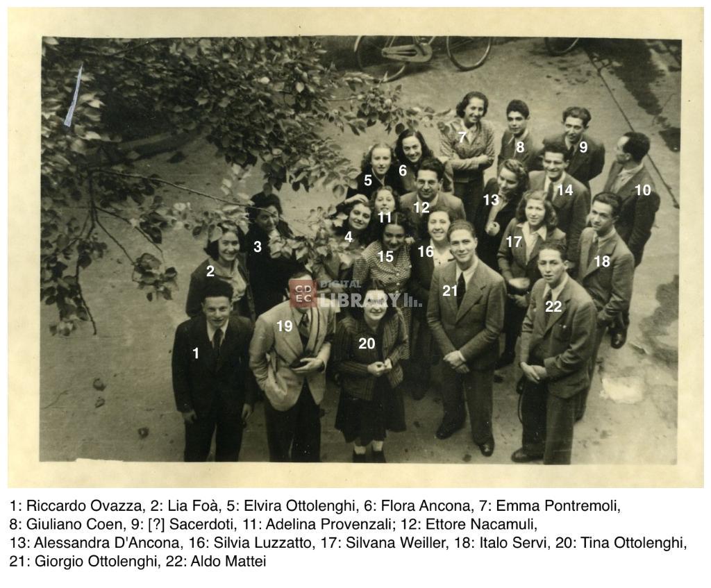osservazioni | Nella fotografia si riconoscono 1: Riccardo Ovazza, 2: Lia Foà (poi coniugata Lancieri), 5: Elvira Ottolenghi, 6: Flora Ancona (poi coniugata Sabbadini), 7: Emma Pontremoli (poi coniugata Albert), 8: Giuliano Coen, 9: [?] Sacerdoti, 11: Adelina Provenzali; 12: Ettore Nacamuli, 13: Alessandra D'Ancona, 16: Silvia Luzzatto, 17: Silvana Weiller (poi coniugata Romanin Jacur), 18: Italo Servi, 20: Tina Ottolenghi (poi coniugata Pesaro), 21: Giorgio Ottolenghi, 22: Aldo Mattei |