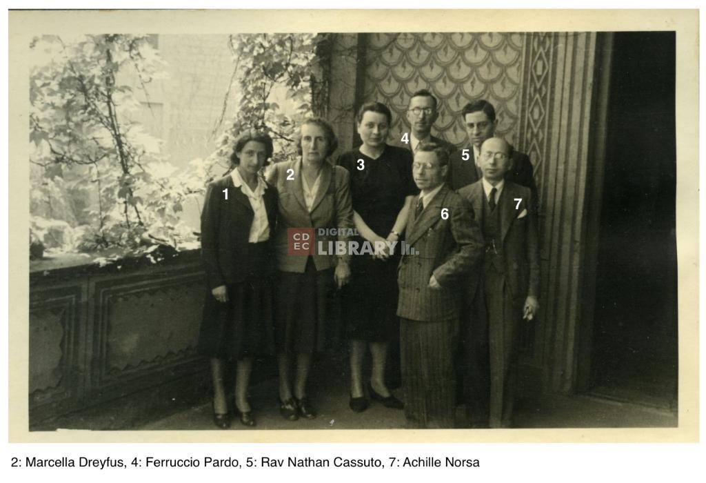 osservazioni | Nella fotografia si riconoscono 2: Marcella Dreyfus, 4: Ferruccio Pardo, 5: Rav Nathan Cassuto, 7: Achille Norsa |