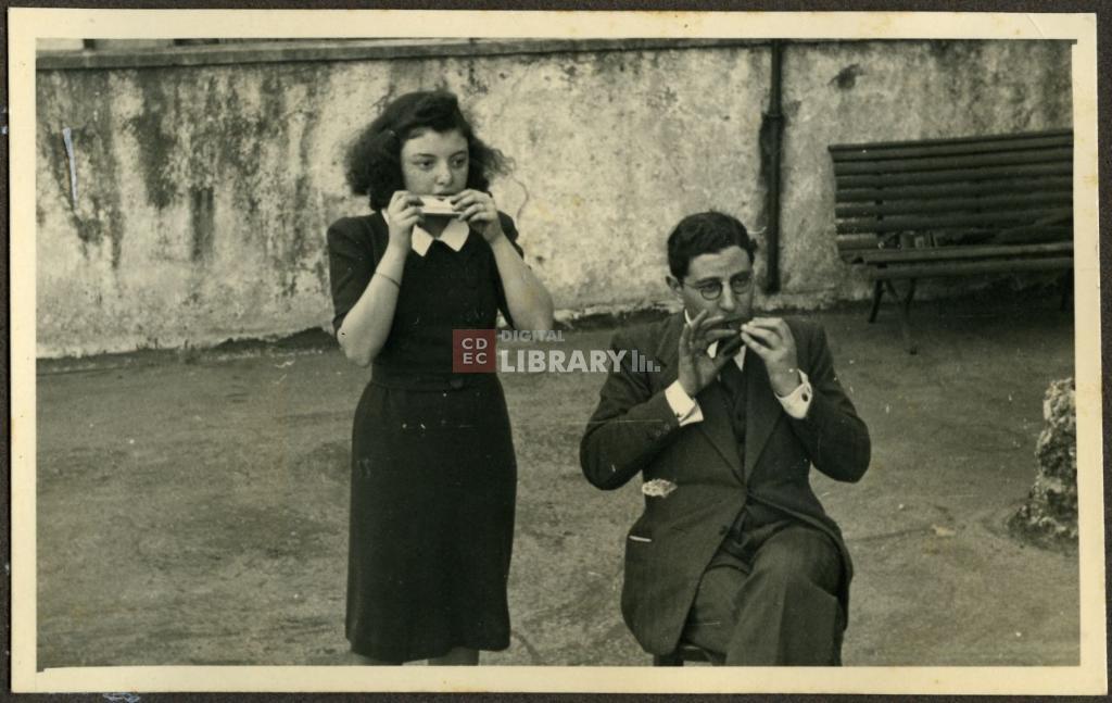 titolo attribuito | Ritratto di Rav Nathan Cassuto con Alda Voghera mentre suonano nel cortile della scuola ebraica di Milano |