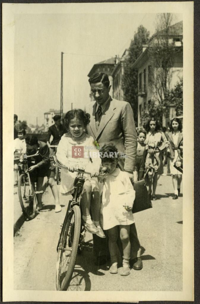 titolo attribuito | Ritratto di Rav Nathan Cassuto con i figli Susanna e David Cassuto in via Eupili a Milano all'uscita della scuola ebraica |