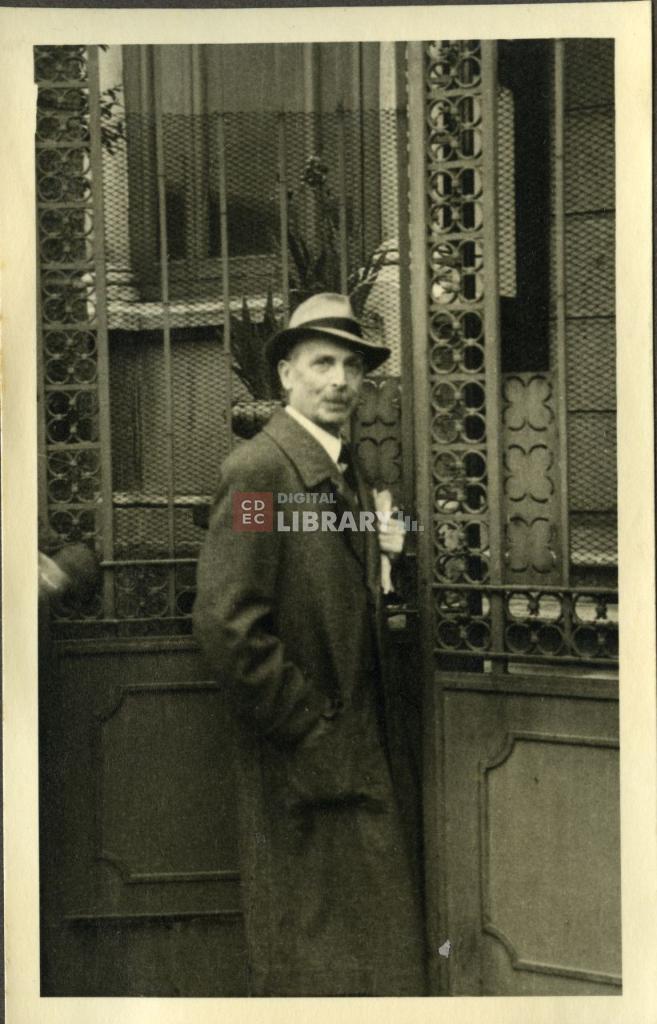 titolo attribuito | Ritratto del professore Levi al cancello d'ingresso della scuola ebraica di Milano |