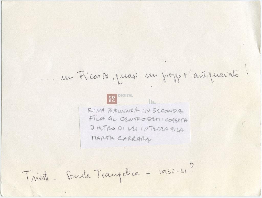 iscrizioni | sul verso del supporto l'indicazione manoscritta "...un Ricordo, quasi un pezzo d'antiquariato!/ Trieste - Scuola Evangelica - 1930-31?" e sull'etichetta bianca "Rina Brunner in seconda fila al centro semicoperta dietro di lei in terza fila Marta Carrara" |