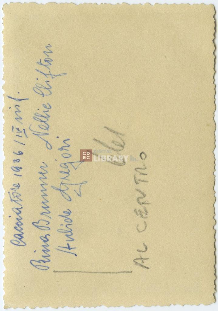 iscrizioni | sul verso del supporto l'indicazione manoscritta a penna "Cacciatore 1936 IV [...] Rina Brunner Nellie Clifton Aulide Gregori" e a matita "al centro" |