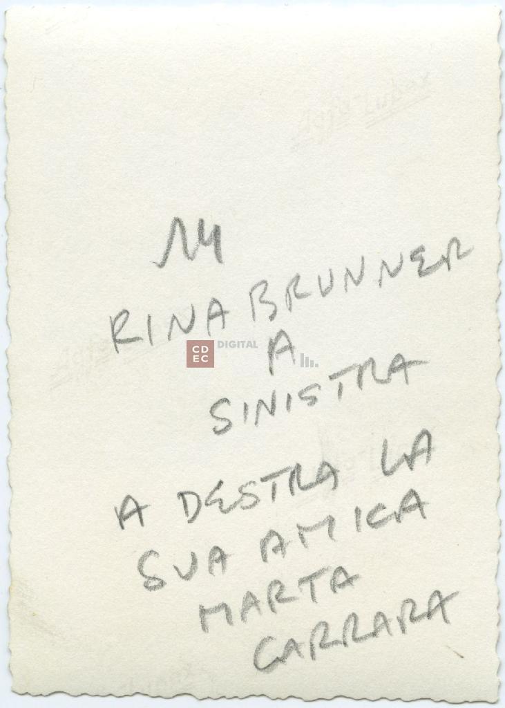 iscrizioni | sul verso del supporto l'indicazione manoscritta a matita "Rina Brunner a sinistra/ a destra la sua amica Marta Carrara" |