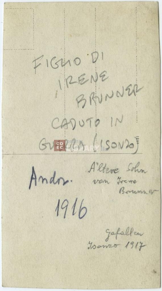 iscrizioni | sul verso del supporto l'indicazione manoscritta "Ältere sohn von Irene Brunner Isonzo Gafallen 1917/ Andor 1916/ Figlio di Irene Brunner caduto in guerra (Isonzo)" |