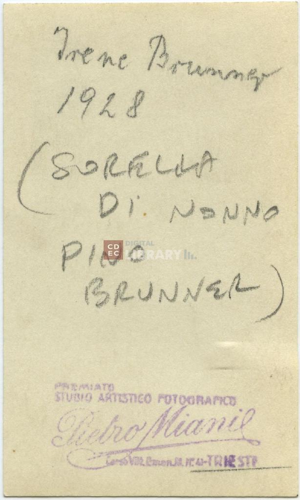 iscrizioni | sul verso del supporto l'indicazione manoscritta "Irene Brunner 1928/ (sorella di nonno Pino Brunner)" |